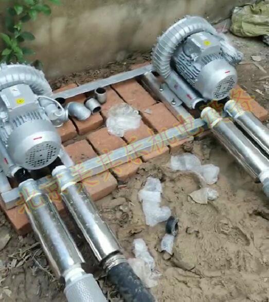 該池塘采用養(yǎng)殖模式,密度比較大,需要不停機連續(xù)運行,所以微孔增氧風機采用一用一備模式,家用電220v,2.2kw單葉輪風機,后期要加裝防雨棚,