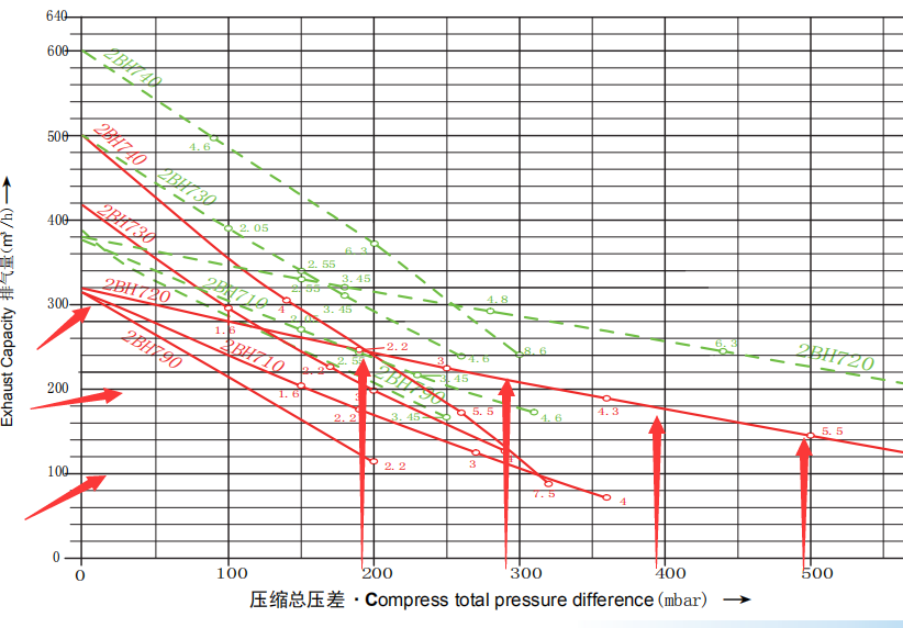 高壓風機性能曲線詳細解析及理解如下:(以圖所示,常用型號720為例,箭頭所示)