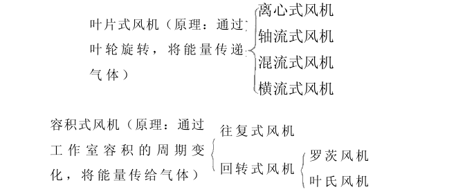 而風(fēng)機(jī)呢,按工作原理不同,風(fēng)機(jī)可分為葉片式(又稱葉輪式或透平式)和容積式(又稱定排量式)兩大類,其進(jìn)一步分類如下圖所示: