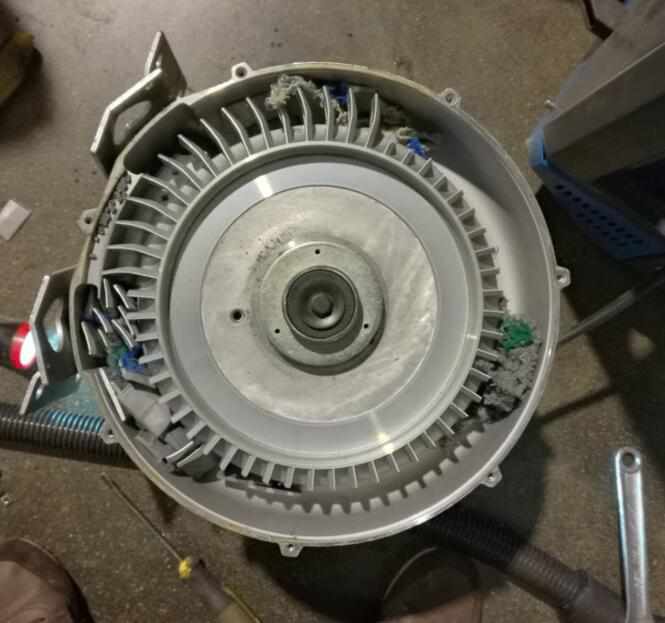 圖為損壞之后的葉輪,因進(jìn)風(fēng)口吸進(jìn)去雜物,導(dǎo)致四周的葉片被堅(jiān)硬物打碎。所以一要定做好進(jìn)風(fēng)口的防護(hù)工作。