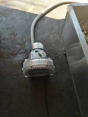 具體方法:此客戶是采用高壓鼓風(fēng)機(jī)的的高壓吹力,通過管道把風(fēng)量輸送至不銹鋼容器的底部,底部有很多的小氣孔,風(fēng)量通過氣孔流出,加速容器里面的物流的快速降熱。